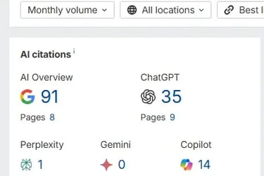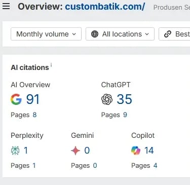 Optimalisasi halaman blog dengan menerbitkan artikel artikel yang mengandung kata kunci potensial selain meningkatkan trafik organik, juga menjadikan webiste custombatik.com menjadi rujukan dalam pencarian mode AI dengan munculnya artikel di AI Citations baik di AI Overview, ChatGPT, Copilot maupun Perplexity